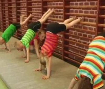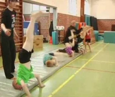 Hovedets position i håndstand Gymnasterne bør kigge på fingrene, men hovedet skal gerne blive så tæt på lodlinjen som muligt. Lad evt. gymnasterne i stående stilling mærke forskellen på at kigge op på fingrene med hovedet i forlængelse af rygsøjlen og med hovedet trukket bagud. Bemærk: I almindelig håndstand skal hovedet helst være lige på kroppen (for at undgå et svaj), men når vi træner kraftspring og flikflak, må hovedet gerne trækkes lidt bagud. Her er det nemlig meningen, at ryggen skal svaje, og er her armene også trukket bagud, så hovedet er egentlig stadig i forlængelse af rygsøjlen – den er bare ikke strakt, når vi arbejder i den spændte svajede position. Hoved skal således optimalt set altid være, så ørerne er mellem armene (det kan dog være en udfordring for nogen i det spændte svaj pga. manglende skuldersmidighed).