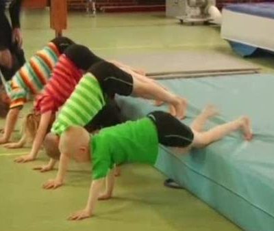 Sig til gymnasterne, at de skal klemme ballerne sammen (som om de holder en guldmønt mellem ballerne) og hjælp dem evt. med at finde en helt lige position i kroppen.